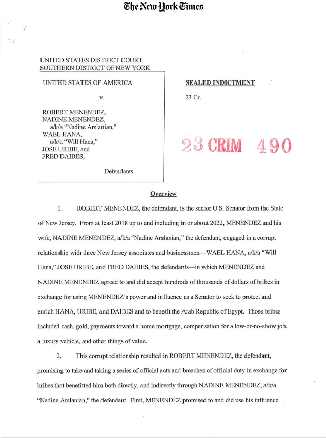 Όπως αναφέρεται σχετικά, η εισαγγελία των ΗΠΑ στο Μανχάταν κατηγόρησε τους κατηγορούμενους ότι δέχθηκαν δωροδοκία χιλιάδων δολαρίων με αντάλλαγμα να χρησιμοποιήσουν τη δύναμη και την επιρροή του Μενέντεζ ως γερουσιαστή, ούτως ώστε να επιδιώξουν να προστατεύσουν και να πλουτίσουν τους επιχειρηματίες και να ωφελήσουν την κυβέρνηση της Αιγύπτου.