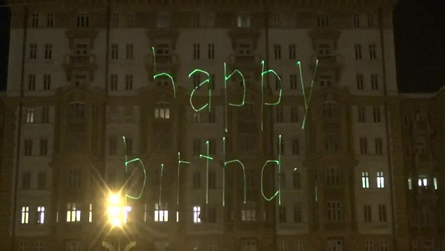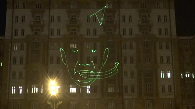 Χρησιμοποιώντας λέϊζερ, σχημάτισαν στην πρόσοψη της αμερικάνικης πρεσβείας στη Μόσχα τα «χρόνια πολλά», μόνο που στο τέλος σχηματίστηκε το πρόσωπο του έγχρωμου προέδρου να… καταβροχθίζει μια μπανάνα…