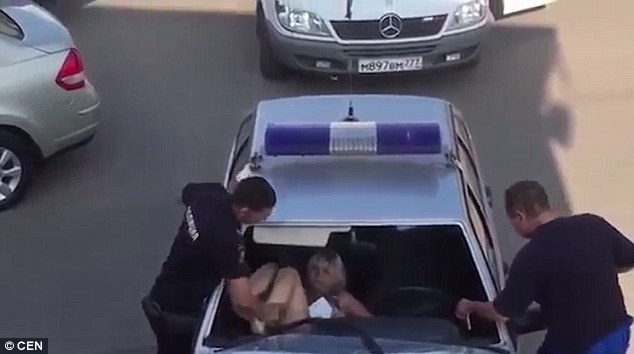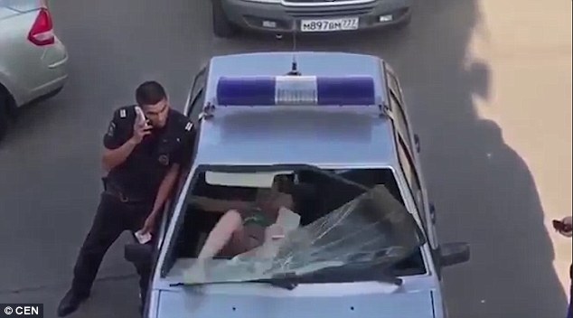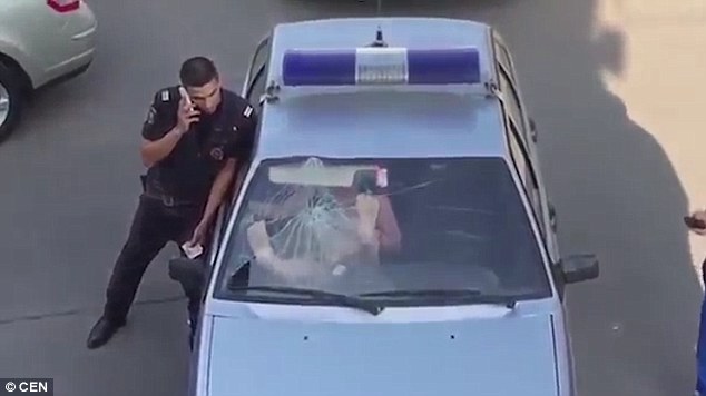 Οι αστυνομικοί την έβαλαν στο αυτοκίνητο και λίγα λεπτά μετά όπως φαίνεται και στο βίντεο κλωτσάει το μπροστινό τζάμι του αυτοκινήτου μέχρι που το διαλύει εντελώς.