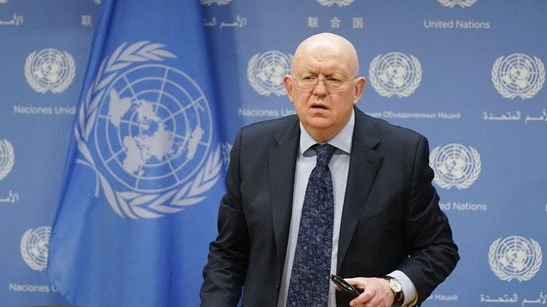 «Σε αυτόν τον πόλεμο, όπως και πριν από 80 χρόνια, εμπλέκονται ύπουλοι και ισχυροί εχθροί οι οποίοι θέλουν να κυριεύσουν τη χώρα μας και να μας καθυποτάξουν», είπε ο Βασίλι Νεμπένζια απευθυνόμενος στη Γενική Συνέλευση.