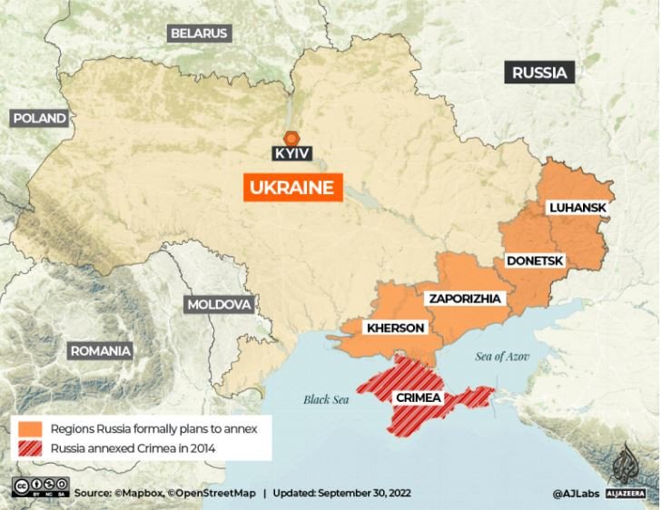 Η Ουκρανία λέει πως τα ρωσικά στρατεύματα πρέπει να φύγουν από κάθε εκατοστό ουκρανικού εδάφους περιλαμβανομένων των τεσσάρων προσαρτημένων περιοχών και της χερσονήσου της Κριμαίας, την οποία η Μόσχα προσάρτησε από την Ουκρανία το 2014 προτού μπορέσει να συζητηθεί ένα ειρηνευτικό σχέδιο.