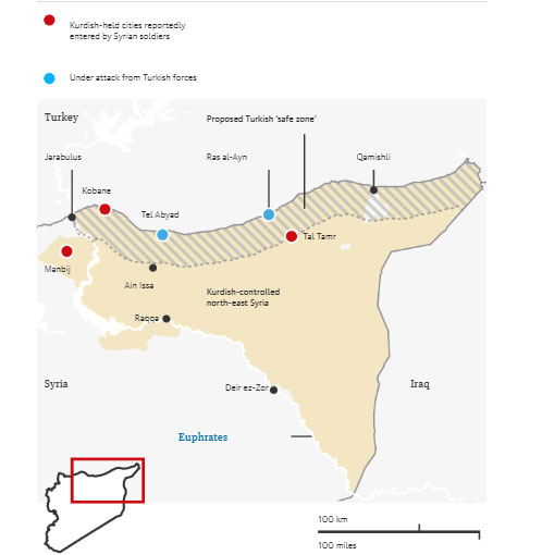 Οι γαλάζιες κουκίδες δείχνουν τις θέσεις των Τούρκων εισβολέων. Με κόκκινο χρώμα οι θέσεις των κουρδικών πολιτοφυλακών. Με μαύρο χρώμα απεικονίζονται οι θέσεις των συριακών – κυβερνητικών δυνάμεων. Η διαγραμμισμένη περιοχή δείχνει τη ζώνη ασφαλείας που επιθυμεί να επιβάλλει η Άγκυρα.