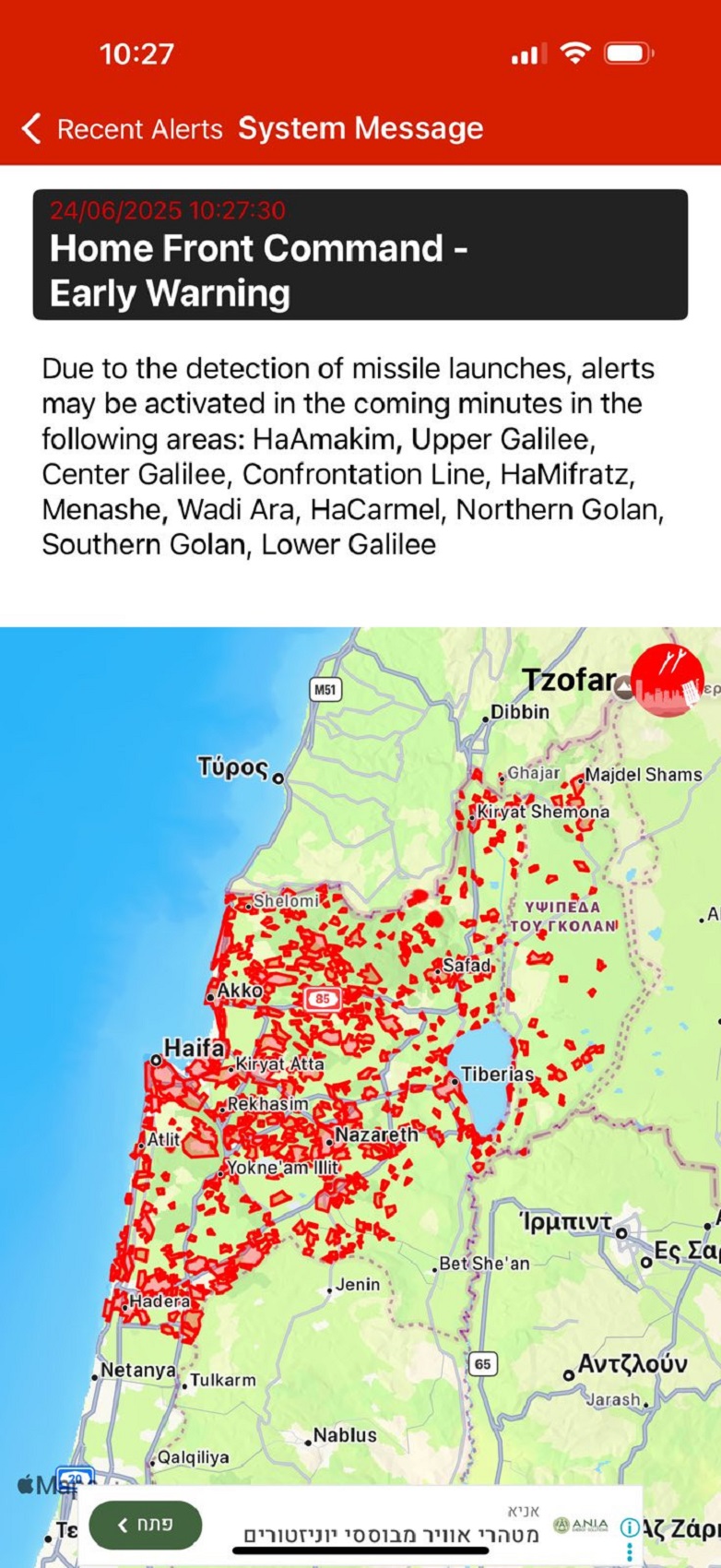 Σύμφωνα με πληροφορίες, ιρανικά κρατικά μέσα ενημέρωσης ανακοίνωσαν την εφαρμογή της εκεχειρίας ωστόσο μέχρι και λίγα λεπτά πριν τις 7:00 το Ισραήλ δεχόταν κύμα βαλλιστικών πυραύλων από το Ιράν