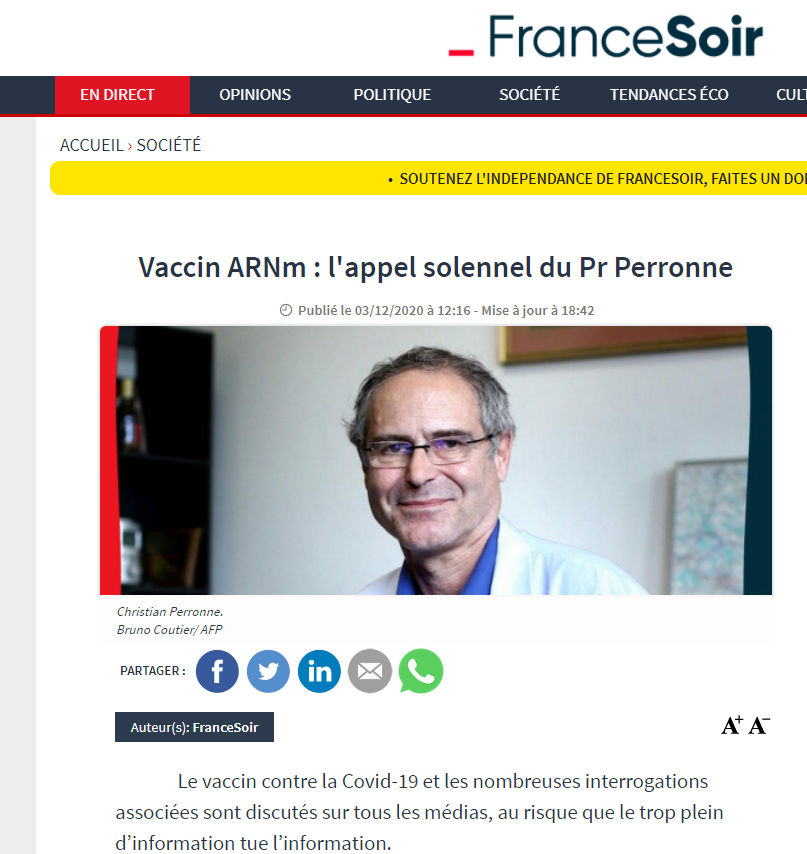 H γαλλική εφημερίδα Francesoir δημοσίευσε στις 3 Δεκεμβρίου την επιστολή του Καθηγητή Λοιμωξιολογίας Christian Perronne με τίτλο ”Eμβόλιο mRNA: ηχηρή έκκληση από τον καθηγητή Perronne” όπου αναπαράγει την ανοιχτή επιστολή του που δημοσίευσε ο ίδιος στον προσωπικό του λογαριασμό στο facebook και για την οποία μίλησε και στο Sud Radio.