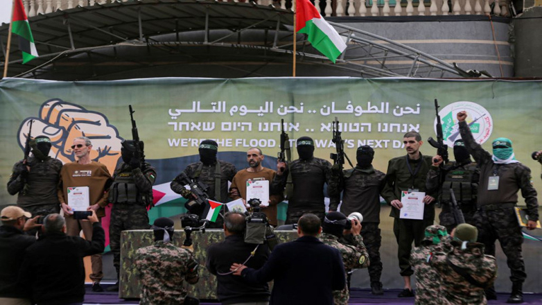 Οπλισμένοι μαχητές του παλαιστινιακού ισλαμιστικού κινήματος είχαν προηγουμένως οδηγήσει τους τρεις ομήρους να ανέβουν σε εξέδρα προτού τους παραδώσουν στα μέλη της Διεθνούς Επιτροπής του Ερυθρού Σταυρού στην Ντέιρ Αλ Μπάλαχ.