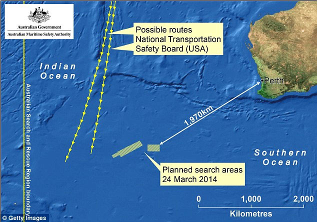 Ένα θαλάσσιο κομμάτι 2.500 χιλιομέτρων νοτιοδυτικά του Περθ είναι το σημείο που πιθανόν θα είχε συντριβεί το αεροπλάνο εάν συνέχιζε να πετά έως ότου εξαντληθούν τα καύσιμά του. Βάσει εικόνων που έχουν σταλεί από κινεζικούς και πρόσφατα γαλλικούς δορυφόρους, η περιοχή αναζήτησης έχει περιοριστεί σε 59.000 τετραγωνικά χιλιόμετρα, σε μία από τις πιο απομακρυσμένες περιοχές της Γης.