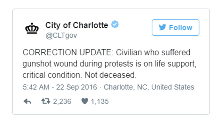 Ωστόσο οι φήμες που κυκλοφορούν στην πόλη, κάνουν λόγο για νεκρό διαδηλωτή από πυρά αστυνομικών. Μόνο που αυτό δεν επιβεβαιώνεται και νεότερες σημερινές πληροφορίες αναφέρουν πως ο διαδηλωτής είναι σε κρίσιμη κατάσταση σε νοσοκομείο της Βόρειας Καρολίνας, αλλά δεν έχει πεθάνει.