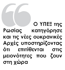 Ο ΥΠΕΞ της Ρωσίας κατηγόρησε και τις νέες ουκρανικές Αρχές υποστηρίζοντας ότι επιτίθενται στις μειονότητες που ζουν στη χώρα. «Οι εξτρεμιστές εξακολουθούν να ελέγχουν τις πόλεις. Αντί αυτών που υποσχέθηκαν, σχημάτισαν μια κυβέρνηση νικητών. Μια απόφαση ελήφθη στη Ράντα (το ουκρανικό Κοινοβούλιο) να περιοριστούν τα δικαιώματα των μειονοτήτων. Λέχθηκε ότι πρέπει να τιμωρηθεί η ρωσική γλώσσα. Οι νικητές έχουν σκοπό να χρησιμοποιήσουν τους καρπούς των νικών τους για να καταφερθούν εναντίον των ανθρωπίνων δικαιωμάτων» τόνισε.