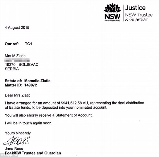 Η Μαρίγια Ζλάτιτς, η οποία ζει με μία σύνταξη ύψους 65 ευρώ το μήνα σε ορεινή περιοχή κοντά στο Μπόλιεβατς της ανατολικής Σερβίας, ενημερώθηκε ότι κληρονόμησε 940.000 δολάρια Αυστραλίας (611.000 ευρώ) από τον σύζυγό της, ο οποίος πέθανε το 2011.