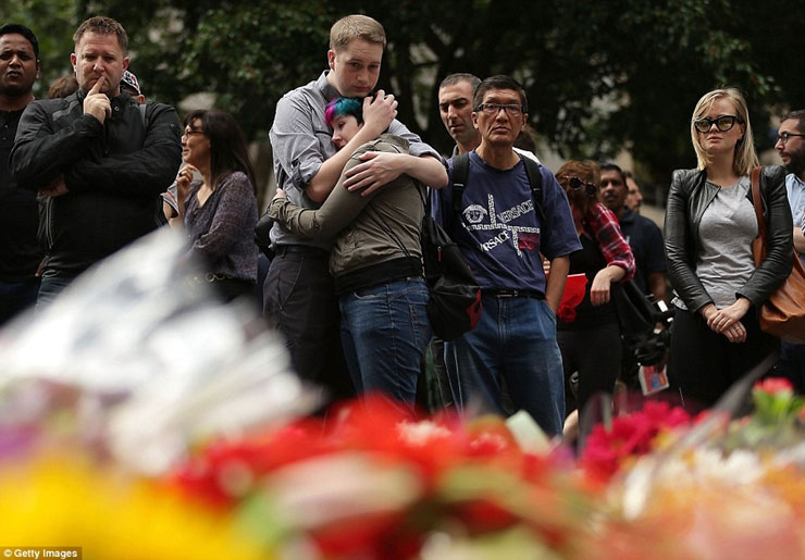Μία ημέρα έπειτα από το χτύπημα ενόπλου σε καφετέρια στην καρδιά του Σύδνεϋ, πλήθος κόσμου από κάθε γωνιά της πόλης συρρέει στο σημείο προκειμένου να αποτίσουν φόρο τιμής στα θύματα.