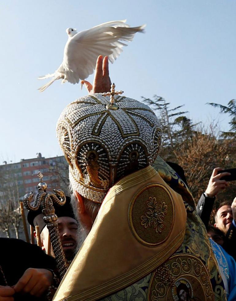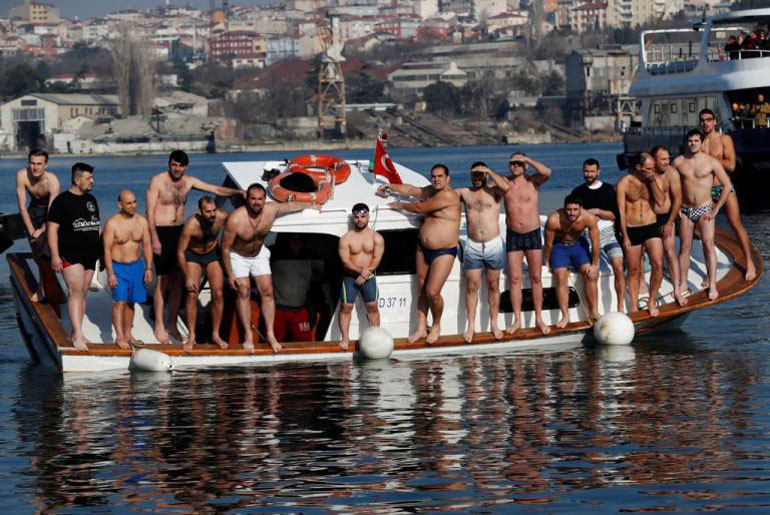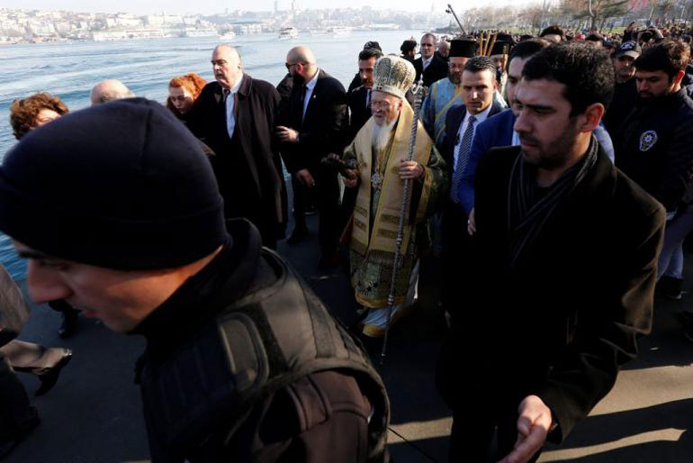 Ρίγη συγκίνησης στο Φανάρι της Κωνσταντινούπολης, κατά την τελετή αγιασμού των υδάτων από τον Οικουμενικό Πατριάρχη Βαρθολομαίο. Οι Έλληνες κολυμβητές που βούτηξαν στον Κεράτιο κόλπο, έβγαλαν μια ελληνική σημαία και τραγούδησαν όλοι μαζί τον Εθνικό Ύμνο.