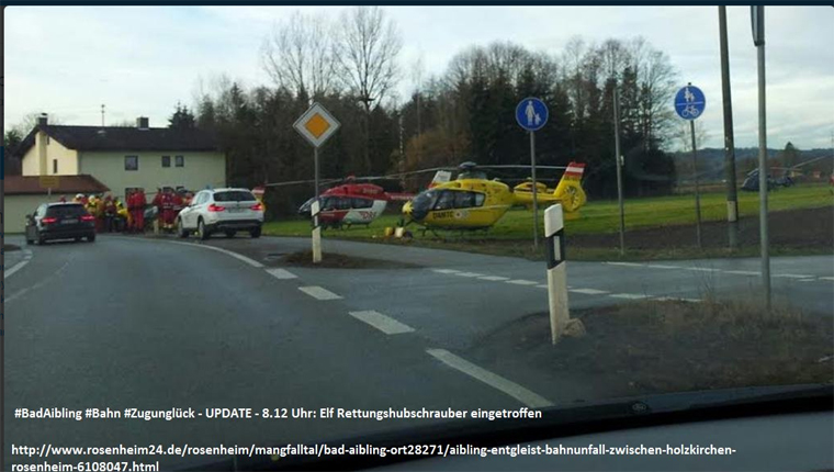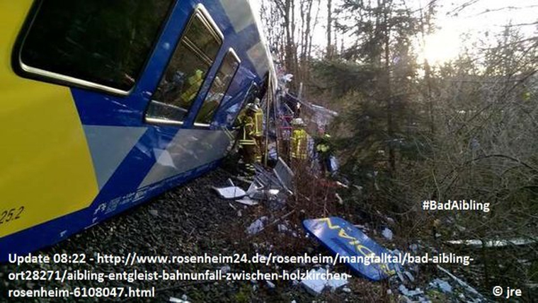 Ένα τρένο εκτροχιάστηκε κάτω από αδιευκρίνιστες συνθήκες, με αποτέλεσμα να συγκρουστεί με έτερη διερχόμενη αμαξοστοιχίαΕκπρόσωπος της τοπικής αστυνομίας, ο Jürgen Thalmeier, ανέφερε στο δίκτυο Rosenheim24 ότι «αρκετά άτομα σκοτώθηκαν κατά τη σύγκρουση». Το RT, επικαλούμενο δηλώσεις εκπροσώπου των αστυνομικών αρχών, κάνει λόγο για τουλάχιστον 9 νεκρούς και 150 τραυματίες.