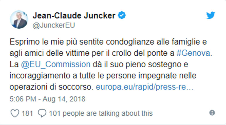 «Είμαι βαθιά λυπημένος από την κατάρρευση της γέφυρας στη Γένοβα σήμερα, που έχει στοιχίσει πολλές ζωές» δήλωσε ο πρόεδρος της Ευρωπαϊκής Επιτροπής Ζαν-Κλοντ Γιούνκερ. Εκ μέρους της Ευρωπαϊκής Επιτροπής, ο κ. Γιούνκερ εκφράζει τη βαθύτατη συμπόνια και τα ειλικρινή του συλλυπητήρια στις οικογένειες και τους φίλους των θυμάτων και στον ιταλικό λαό.