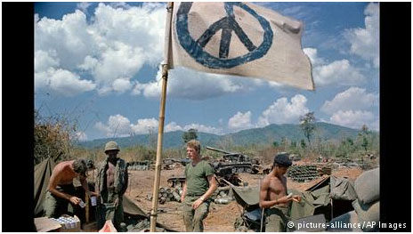 Η αμερικανική επέμβαση στο Βιετνάμ τη δεκαετία του 60 ξεσήκωσε κύμα αντιδράσεων παγκοσμίως. Ειδικότερα στις ΗΠΑ οι μεγάλες αντιπολεμικές διαδηλώσεις για τον πόλεμο στο Βιετνάμ συνδέθηκαν με το κίνημα των χίπηδων. Στη φωτογραφία αμερικανοί στρατιώτες με το σήμα της ειρήνης στα σύνορα Βιετνάμ-Λάος.
