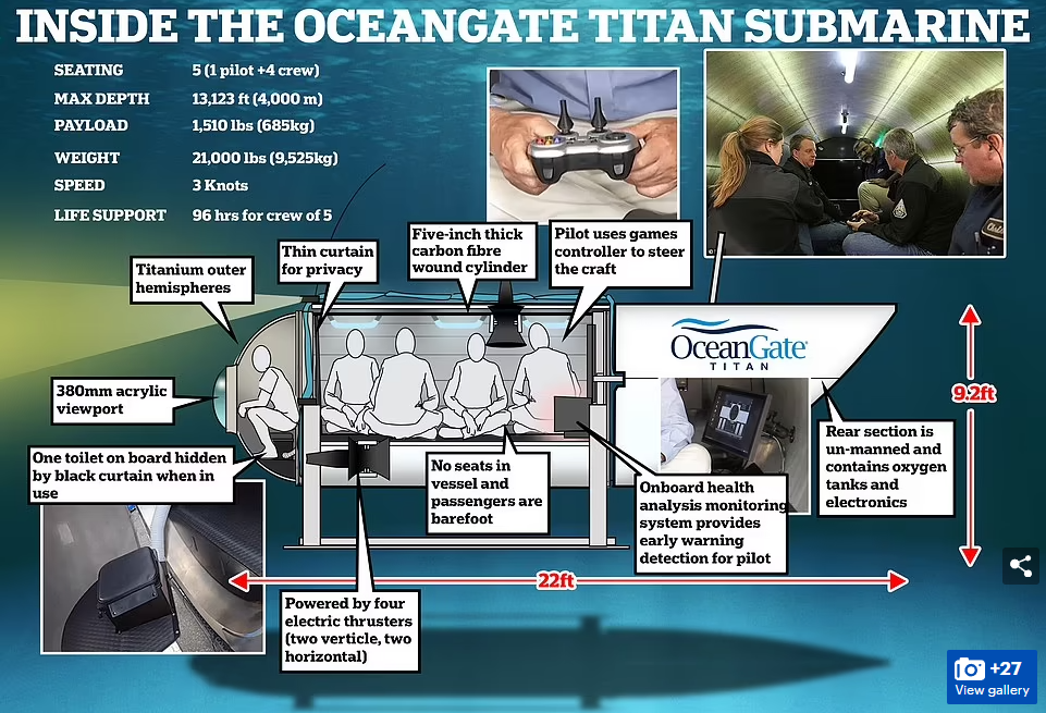 Όσοι βρίσκονται στο πλοίο, συμπεριλαμβανομένου του Βρετανού δισεκατομμυριούχου και εξερευνητή Χάμις Χάρντινγκ, θα πρέπει να αντιμετωπίσουν τις στενές συνθήκες και όλα αυτά ενώ δεν θα μπορούν να δουν πέρα ​​από τα μαύρα βάθη του ωκεανού. Δεν χρειάζεται απλώς να αντιμετωπίσουν τις κλειστοφοβικές συνθήκες στο σκάφος, στο οποίο περιλαμβάνει μια τουαλέτα που έχει μόνο μια κουρτίνα για την προστασία της ιδιωτικής ζωής, αλλά και μια φθίνουσα παροχή οξυγόνου και τον κίνδυνο υποθερμίας.