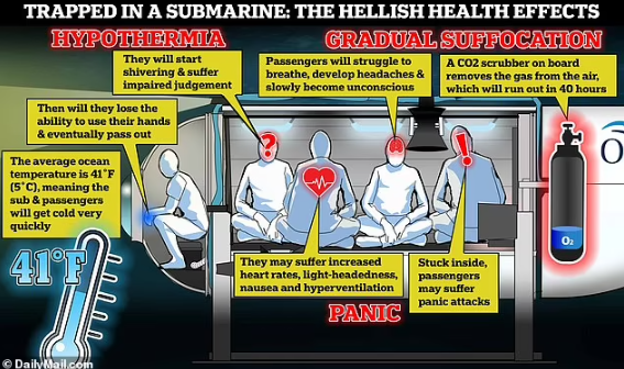 Το υποβρύχιο Titan που εξακολουθεί να λείπει θα έχει ένα φίλτρο διοξειδίου του άνθρακα για να απομακρύνει το υπερβολικό τοξικό αέριο που συσσωρεύεται όταν οι επιβάτες εκπνέουν στον περιορισμένο χώρο, αλλά στα περισσότερα σκάφη αυτό θα έχει περιορισμένη χωρητικότητα. Υπάρχει επίσης κίνδυνος υποθερμίας λόγω των χαμηλών θερμοκρασιών στα βάθη του ωκεανού, καθώς και του υπεραερισμού που προκαλείται από κρίσεις πανικού, οι οποίες μπορούν να καταναλώσουν περισσότερο πολύτιμο οξυγόνο.