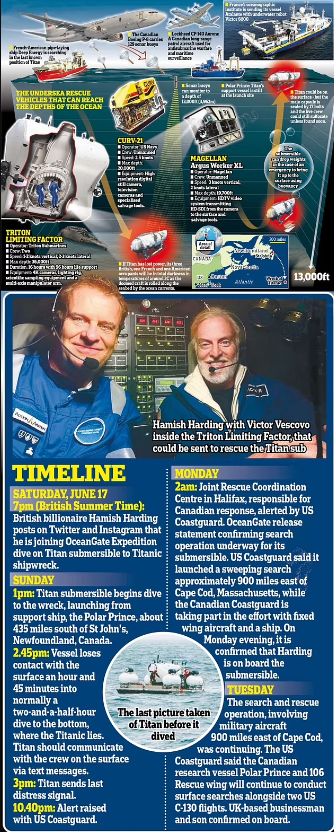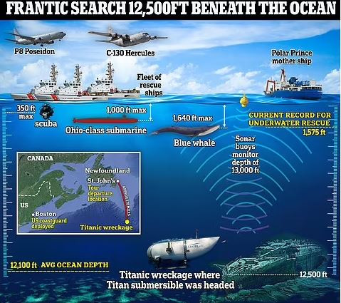 Αλλά ώρες μετά τη λήψη των τελικών εικόνων, το υποβρύχιο κατέβηκε στα σκοτεινά βάθη του Ατλαντικού Ωκεανού για να δει το ναυάγιο στα 12.500 πόδια πριν χάσει κάθε επικοινωνία με τον Polar Prince – 350 μίλια από την ακτή της Newfoundland, στον Καναδά. Το υποβρύχιο, το οποίο ανήκει και λειτουργεί από την OceanGate Expeditions, είχε εκτοξευθεί γύρω στις 4 το πρωί της Κυριακής και έπαιρνε το πλήρωμα 12.500 πόδια κάτω από το νερό ως μέρος της περιοδείας του στο ναυάγιο του 1912 με 195.000 £ το άτομο. Αλλά το πλήρωμα έχασε την επικοινωνία με το μητρικό σκάφος του υποβρυχίου MV Polar Prince μία ώρα και 45 λεπτά μετά τη δίωρη κάθοδο και τώρα υπάρχει μια απεγνωσμένη αναζήτηση για να βρεθεί το σκάφος και όσοι επέβαιναν στο σκάφος πριν τελειώσει ο αέρας.