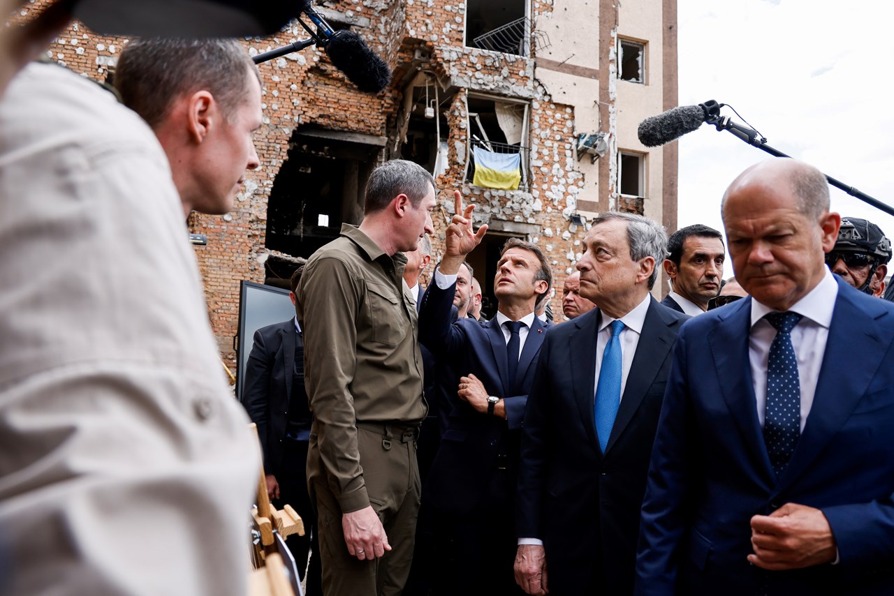 Όπως και άλλοι ξένοι ηγέτες που είχαν μεταβεί στο Κίεβο πριν απ’ αυτούς, οι Μακρόν, Σολτς, Ντράγκι και Γιοχάνις περπάτησαν στους δρόμους του Ιρπίν, όπου τα σημάδια των βομβαρδισμών είναι πανταχού παρόντα.