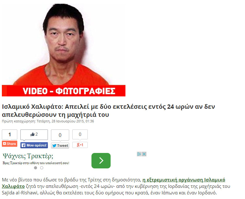 Η φωνή στο βίντεο προσθέτει πως άλλος ένας όμηρος, ο Ιορδανός πιλότος Μουάθ αλ-Κασάεσμπεχ έχει ακόμη λιγότερο χρόνο ζωής. Η Ιαπωνία επιβεβαίωσε την ύπαρξη του βίντεο χθες, Τρίτη, στις 11 μ.μ. (16.00 ώρα Ελλάδας).