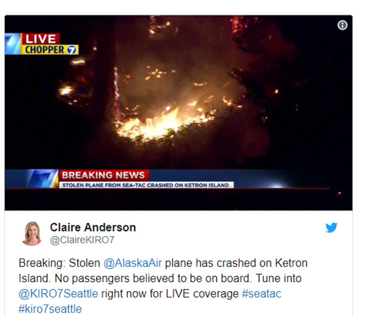 «Επιβεβαιώσαμε ότι το Horizon Air Q400 που απογειώθηκε χωρίς άδεια από το αεροδρόμιο του Σιάτλ συνετρίβη κοντά στο νησί Κέτρον. Προσπαθούμε να επιβεβαιώσουμε ποιος επέβαινε σε αυτό. Πιστεύουμε ότι δεν υπήρχαν επιβάτες ούτε μέλη του πληρώματος, πέρα από τον άνθρωπο που χειριζόταν το αεροσκάφος».