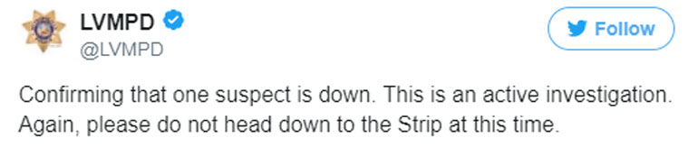 «Επιβεβαιώνουμε ότι ένας ύποπτος εξουδετερώθηκε. Η έρευνα βρίσκεται σε εξέλιξη. Επαναλαμβάνουμε, μην κυκλοφορείτε στην περιοχή της κεντρικής λεωφόρου (the Strip) αυτήν την ώρα», ανακοίνωσε η αστυνομία του Λας Βέγκας στο Twitter.