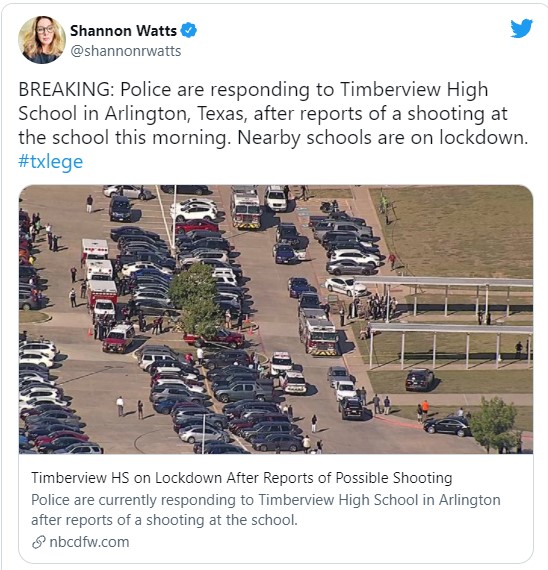 Συναγερμός έχει σημάνει στις Αρχές του Τέξας των ΗΠΑ έπειτα από πυροβολισμούς που σημειώθηκαν σε σχολείο. Όπως αναφέρει ο δήμαρχος του Άρλινγκτον Τζιμ Ρος, τουλάχιστον δύο άτομα έχουν τραυματιστεί, ενώ γίνονται έρευνες για να συλλάβουν τον δράστη.