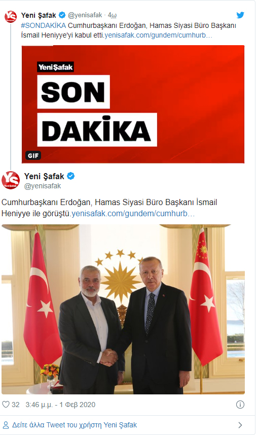 O πρόεδρος της Τουρκίας Ρ.Τ.Ερντογάν είχε συνάντηση με τον πρόεδρο του πολιτικού συμβουλίου της Χαμάς Ismail Heniyye, μια συνάντηση η οποία διαρκεί πολύ ώρα. Τουρκικά μέσα ενημέρωσης εκτιμούν ότι θα υπάρξουν δηλώσεις του προέδρου της Τουρκίας.