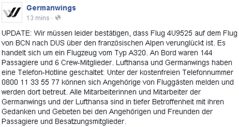 Το προσωπικό της Germanwings και της Lufthansa εκφράζει τη θλίψη του και οι σκέψεις τους και οι προσευχές τους στρέφονται στους συγγενείς και φίλους των επιβατών και του πληρώματος.