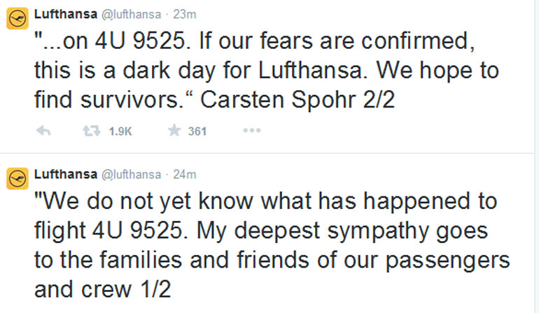 To tweet της Lufthansa για τη συντριβή του αεροσκάφους
