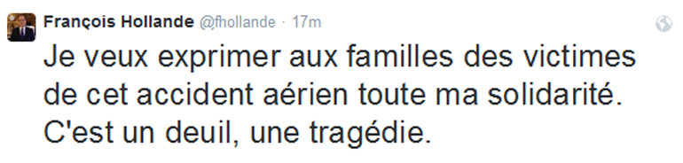 Σε δηλώσεις του προς τους δημοσιογράφους ο πρόεδρος της Γαλλίας εξέφρασε την απαισιοδοξία του για τον εντοπισμό επιζώντων, λέγοντας πως «με βάση τις συνθήκες κάτω από τις οποίες έγινε το δυστύχημα, εκτιμούμε ότι δεν θα υπάρχουν επιζώντες». Ο Φρανσουά Ολάντ πρόσθεσε ότι είναι πολύ δύσκολή η πρόσβαση στο σημείο της συντριβής.