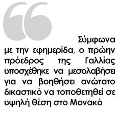Όπως αναφέρει η εφημερίδα, ο πρώην πρόεδρος της Γαλλίας υποσχέθηκε να μεσολαβήσει για να βοηθήσει ανώτατο δικαστικό να τοποθετηθεί σε υψηλή θέση στο Μονακό, ενώ στη συνέχεια άλλαξε γνώμη.