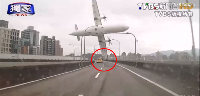 Ερασιτεχνικά video δείχνουν το αεροπλάνο της TransAsia να χάνει ύψος και τμήμα της ουράς και του φτερού να έρχονται σε επαφή με την άκρη της γέφυρας, πριν τελικά το αεροσκάφος συντριβεί στα νερά του ποταμού.