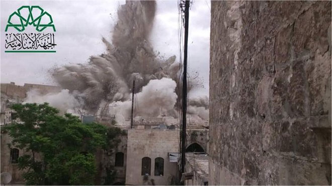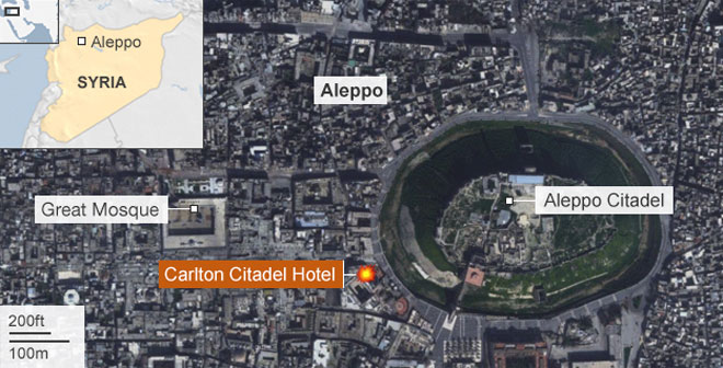 Οι αντικαθεστωτικοί αντάρτες ανατίναξαν σήμερα το ιστορικό ξενοδοχείο Carlton Citadel στο κέντρο του Χαλεπίου, σκοτώνοντας αδιευκρίνιστο αριθμό κυβερνητικών στρατιωτών και ενόπλων καθεστωτικών που το είχαν καταλάβει και το χρησιμοποιούσαν ως βάση από την έναρξη της σύρραξης, σύμφωνα με τη συριακή τηλεόραση και το Συριακό Παρατηρητήριο Ανθρωπίνων Δικαιωμάτων.