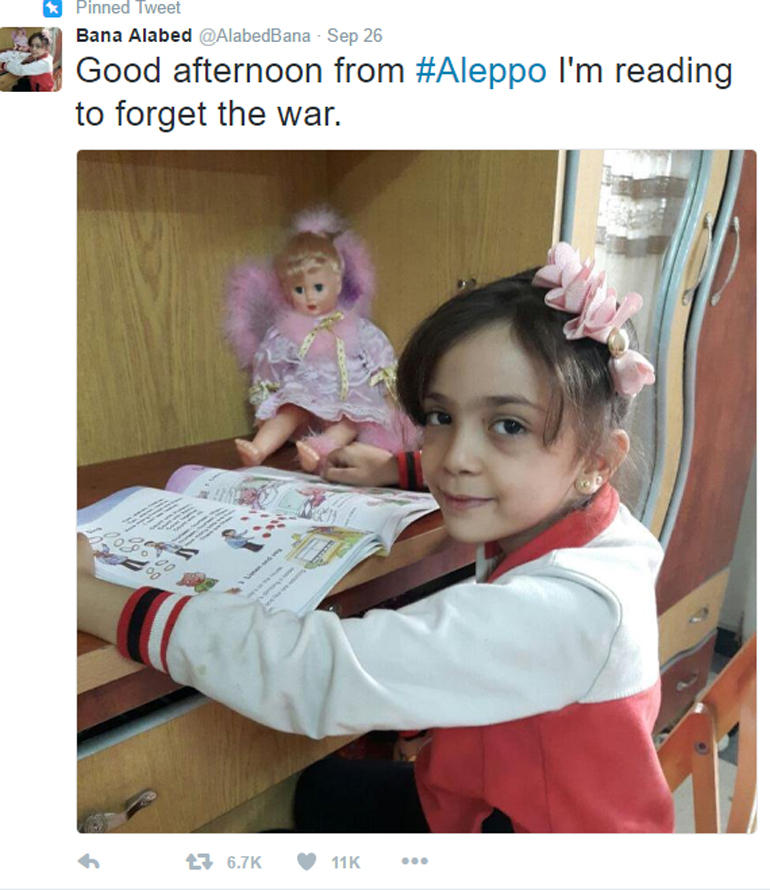 «Καλό απόγευμα από το Χαλέπι (#Aleppo), διαβάζω για να ξεχάσω τον πόλεμο» γράφει η ίδια σε ένα μήνυμα όπου στην φωτογραφία απεικονίζεται το κοριτσάκι να κρατά ένα βιβλίο και μια κούκλα. Σε μια φωτογραφία που ανέβασε σήμερα φαίνεται ο καπνός που έχει καλύψει τον ουρανό και εκείνη γράφει: «καλημέρα από το Χαλέπι. Είμαστε ακόμα ζωντανοί. Μπάνα».