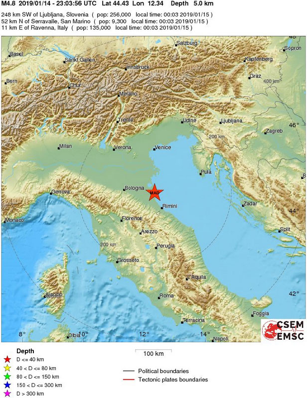 Σεισμική δόνηση μεγέθους 4,8 βαθμών της κλίμακας Ρίχτερ σημειώθηκε τα ξημερώματα της Τρίτης, και συγκεκριμένα στις 1.03 ώρα Ελλάδας, στη Βορειοανατολική Ιταλία, η οποία έγινε αισθητή σε τρεις ακόμη χώρες: στην Κροατία, στη Σλοβενία και το Σαν Μαρίνο.