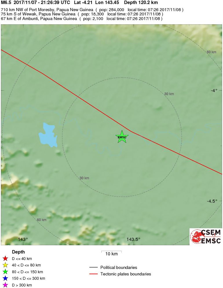 Το επίκεντρο της δόνησης ορίζεται 67 χιλιόμετρα ανατολικά της πόλης Αmbunti και το εστιακό βάθος μετρήθηκε στα 120 χιλιόμετρα.