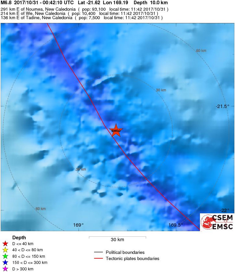 Ισχυρή σεισμική δόνηση μεγέθους 6,8 βαθμών της κλίμακας Ρίχτερ, σημειώθηκε στις 02:42 (ώρα Ελλάδος) με επίκεντρο 136χλμ. ανατολικά της περιοχής Tadine στη Νέα Καληδονία, σύμφωνα με την προκαταρκτική μελέτη του Ευρωπαϊκού-Μεσογειακού Σεισμολογικού Κέντρου.