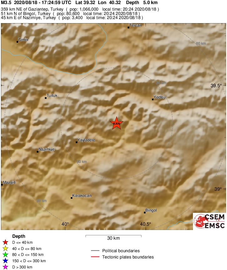Ο σεισμός σύμφωνα με τις αρχικές προβλέψεις είχε βάθος και σημειώθηκε 45 χλμ. ανατολικά της επαρχίας Nazımiye και 23 χλμ. νότιο – δυτικά της επαρχίας Yedisu.