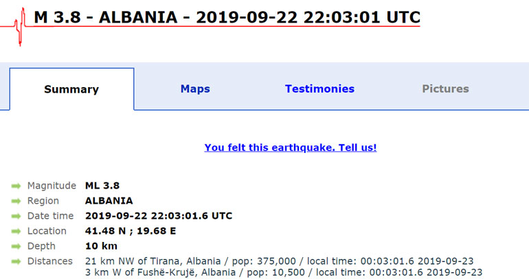 Το επίκεντρο του σεισμού εντοπίζεται 21 χιλιόμετρα βορειοδυτικά των Τιράνων και το εστιακό του βάθος υπολογίζεται στα 10 χλμ.