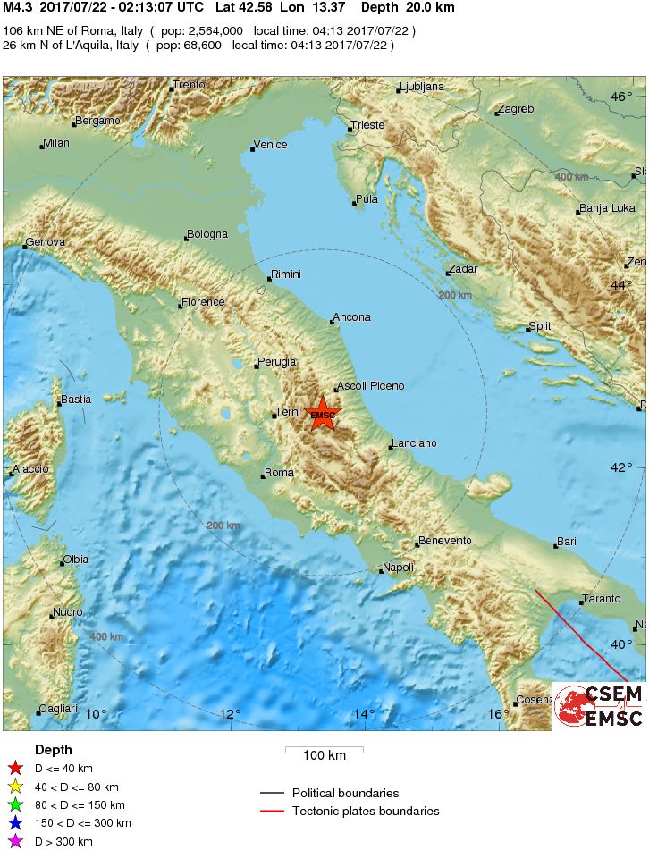 Σεισμική δόνηση μεγέθους 4,2 βαθμών έπληξε νωρίς σήμερα το πρωί την κεντρική Ιταλία, χωρίς να προκαλέσει θύματα ή ζημιές, όπως ανακοίνωσε η υπηρεσία πολιτικής προστασίας.