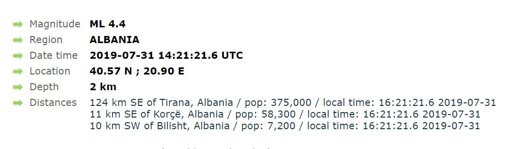 Το επίκεντρο του σεισμού εντοπίστηκε 10 χιλιόμετρα νοτιοανατολικά της πόλης Bilisht και το εστιακό του βάθος υπολογίστηκε στα 2 χλμ.