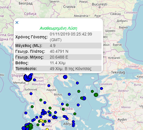 H αυτόματη λύση του Γεωδυναμικού Ινστιτούτου του Εθνικού Αστεροσκοπείου Αθηνών δίνει τον σεισμό με εστιακό βάθος τα 11,4 χλμ. και επίκεντρο 41 χλμ. δυτικά της Καστοριάς και 49 χλμ. βόρεια της Κόνιτσας.