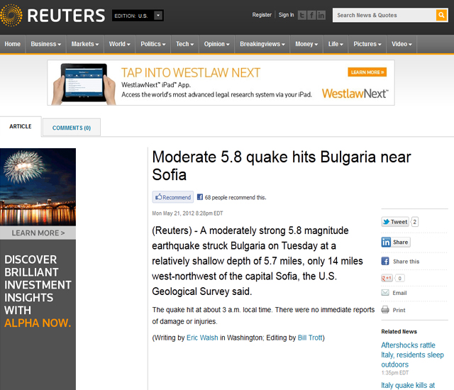 Επικαλούμενο εκτίμηση του Αμερικανικού Γεωφυσικού Ινστιτούτου (USGS), το διεθνές ειδησεογραφικό πρακτορείο Reuters αναφέρει ότι ο σεισμός ήταν 5,8 βαθμοί της κλίμακας ρίχτερ, τονίζοντας πως κάτοικοι στην πρωτεύουσα της Βουλγαρίας βγήκαν ανάστατοι έξω στους δρόμους.