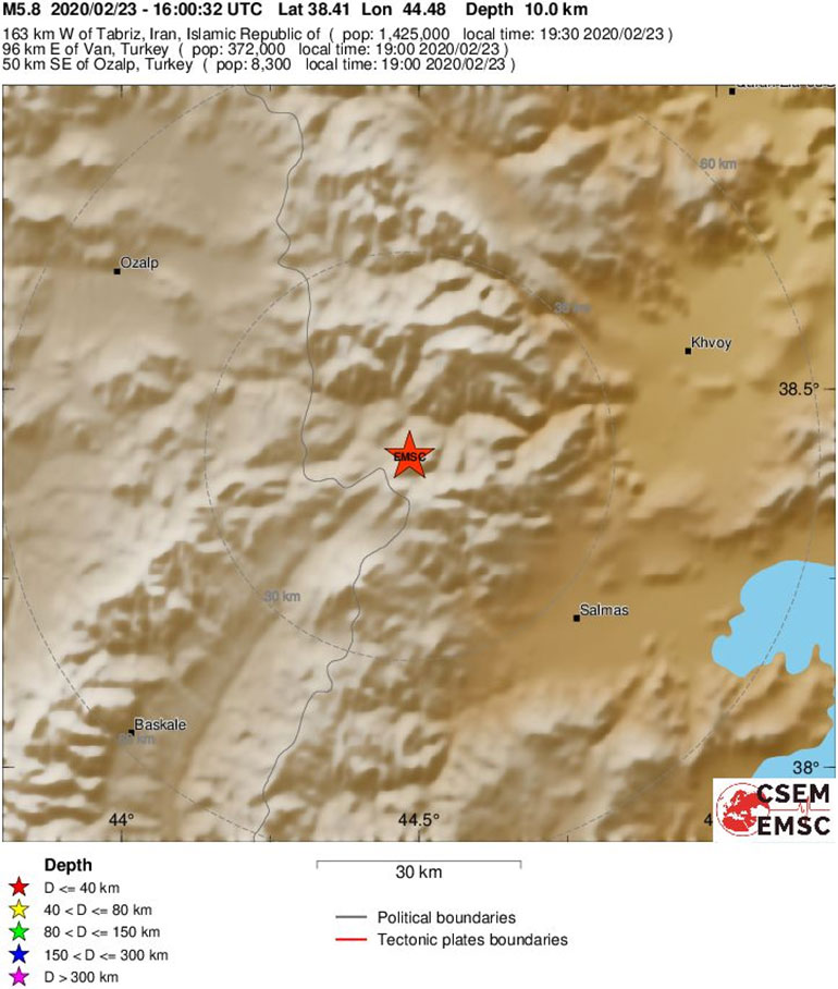Σεισμός μεγέθους 5,8 βαθμών της κλίμακας Ρίχτερ, σημειώθηκε στις 18:00 το απόγευμα της Κυριακής στα σύνορα της Τουρκίας με το Ιράν, σύμφωνα με το Ευρωπαϊκό Μεσογειακό Σεισμολογικό Κέντρο (EMSC).