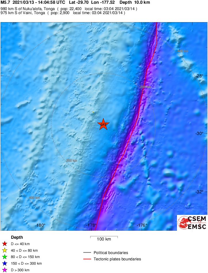 Η δόνηση εντοπίστηκε 975 χλμ. νότια από τη γεωγραφική περιοχή Tonga, σύμφωνα με το Ευρωμεσογειακό Σεισμολογικό Κέντρο (EMSC).