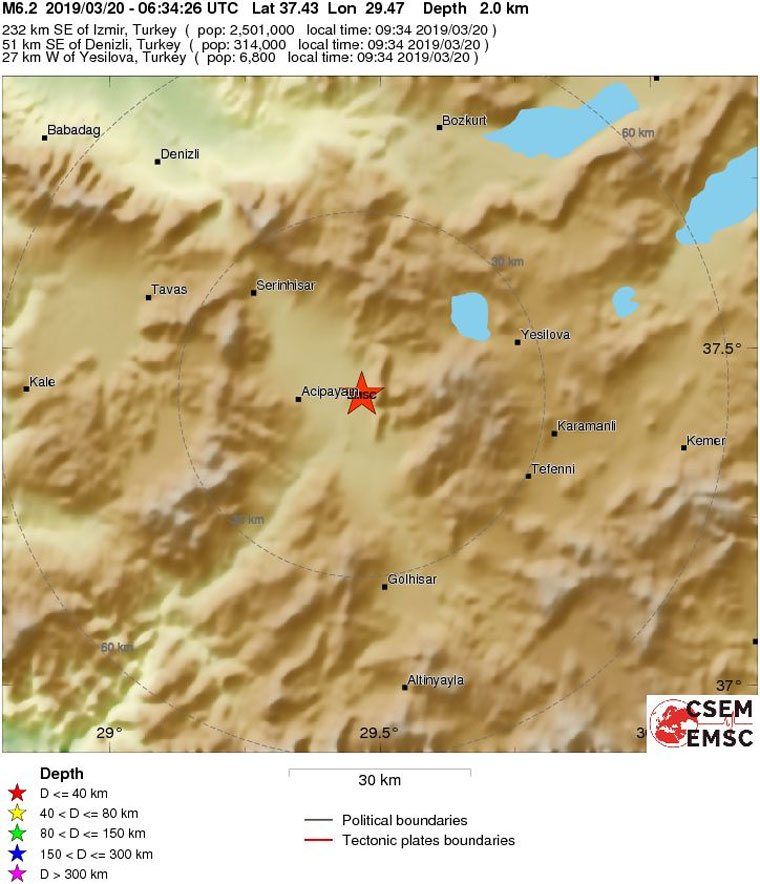 Το επίκεντρο της δόνησης ορίζεται στα 8 χλμ. ανατολικά της Acıpayam και το εστιακό της βάθος στα 11 χλμ.