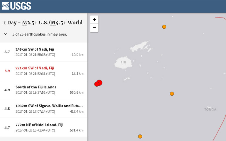 Ισχυρή σεισμική δόνηση μεγέθους 6,9 βαθμών της κλίμακας Ρίχτερ σημειώθηκε 284 νοτιοδυτικά των νησιών Φίτζι, σύμφωνα με το Αμερικανικό Γεωλογικό Ινστιτούτο (USGS).