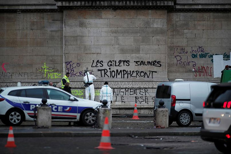 Ο Εμανουέλ Μακρόν επιστρέφοντας από το Μπουένος Άιρες και τη σύνοδο της G20 έσπευσε στην Αψίδα του Θριάμβου, όπου και υποκλίθηκε την ώρα που τα συνεργεία ντυμένα στα λευκά προσπαθούσαν να σβήσουν από το μνημείο τα μαύρα συνθήματα. Στη συνέχεια κατηφόρισε τη λεωφόρο, επισκέφθηκε τις κατεστραμμένες προθήκες των καταστημάτων και συνομίλησε με τους ιδιοκτήτες τους.