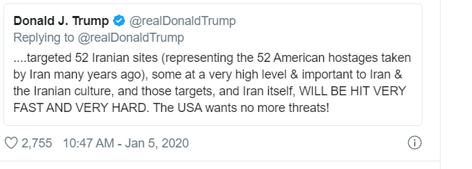 Ωστόσο, ο Ντόναλντ Τραμπ προειδοποίησε χθες μέσω του Twitter ότι οι ΗΠΑ έχουν κλειδώσει 52 ιρανικούς στόχους, περιλαμβανομένων ορισμένων που είναι σημαντικοί για τον ιρανικό πολιτισμό»…