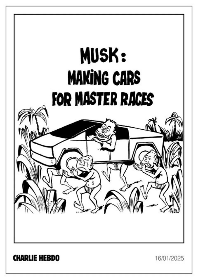 Το περιοδικό σε «αφιέρωμά» του για τον δισεκατομμυριούχο Έλον Μασκ περιλαμβάνει σκίτσα όπου στο ένα εμφανίζεται να βγαίνει ως… σκουλήκι από το φέρετρο του Ζαν Μαρί Λεπέν (με τη λεζάντα «Η ακροδεξιά του μέλλοντος»), ενώ σε άλλο να έχει μια βεντούζα με την οποία… ξεβουλώνει τα οπίσθια του Τραμπ, με τη λεζάντα «Ο Μασκ ξεμπλοκάρει την ελευθερία του λόγου».